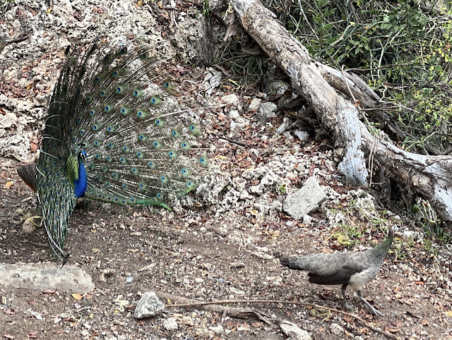 In addition to tortoises, there are also peacocks. The males were trying lots of mating dances to try to attract the females.